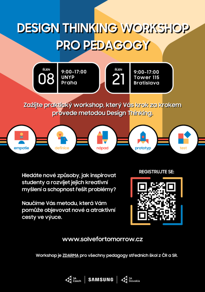 Pro všechny pedagogy středních škol z ČR a SR jsou připraveny praktické celodenní workshopy v rámci kampaně Samsung Solve for Tomorrow, během kterých je lektorka podrobně seznámí s metodologií Design Thinking. Metodu lze využít kdekoliv, kde budete chtít rozvinout kreativní a inovativní myšlení studentů.