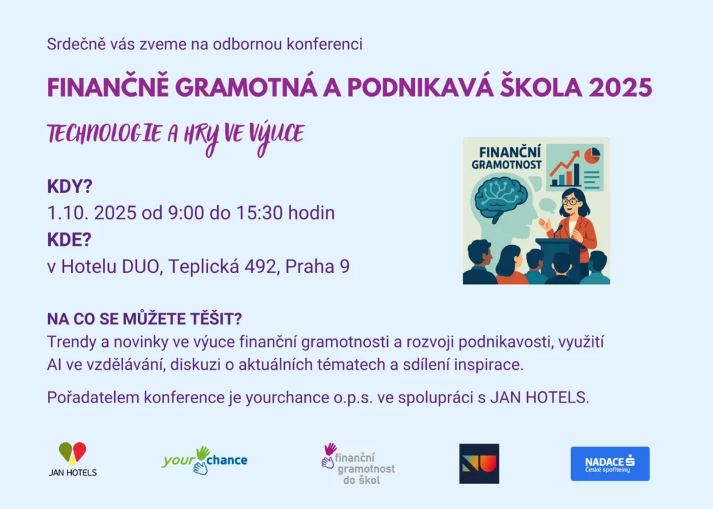 Mezi řečníky budou zástupci Národního pedagogického institutu (NPI), Newton University, Nadace České spořitelny a Institutu prevence a řešení předlužení. Účastníky čeká i diskusní panel o využití moderních technologií a AI ve školách a workshop Myšlením k bohatství.