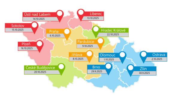 Roadshow postupně navštíví všech třináct krajů, v období od letošního října do listopadu. Jedná se například o Brno, Zlín, Olomouc, Jihlavu, Prahu, Liberec, Plzeň či České Budějovice. Díky regionálnímu rozložení se do programu mohou zapojit i školy, pro které by cesta na centrální konferenci byla příliš komplikovaná. Každé setkání má stejný rámec, takže nezáleží na tom, zda učitel dorazí do krajské metropole na Moravě nebo v Čechách.