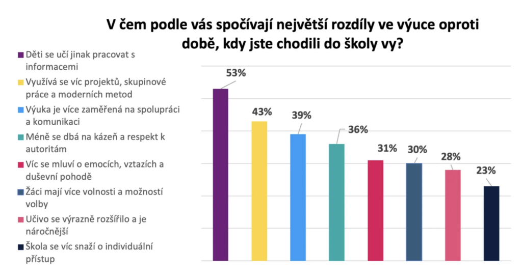 Rodiče zároveň popisují výrazný rozpor mezi tím, co by si přáli, a tím, co jejich děti skutečně zažívají. Více než polovina uvedla, že ve školách jejich dětí stále převládá tradiční výklad doprovázený prací s učebnicí.