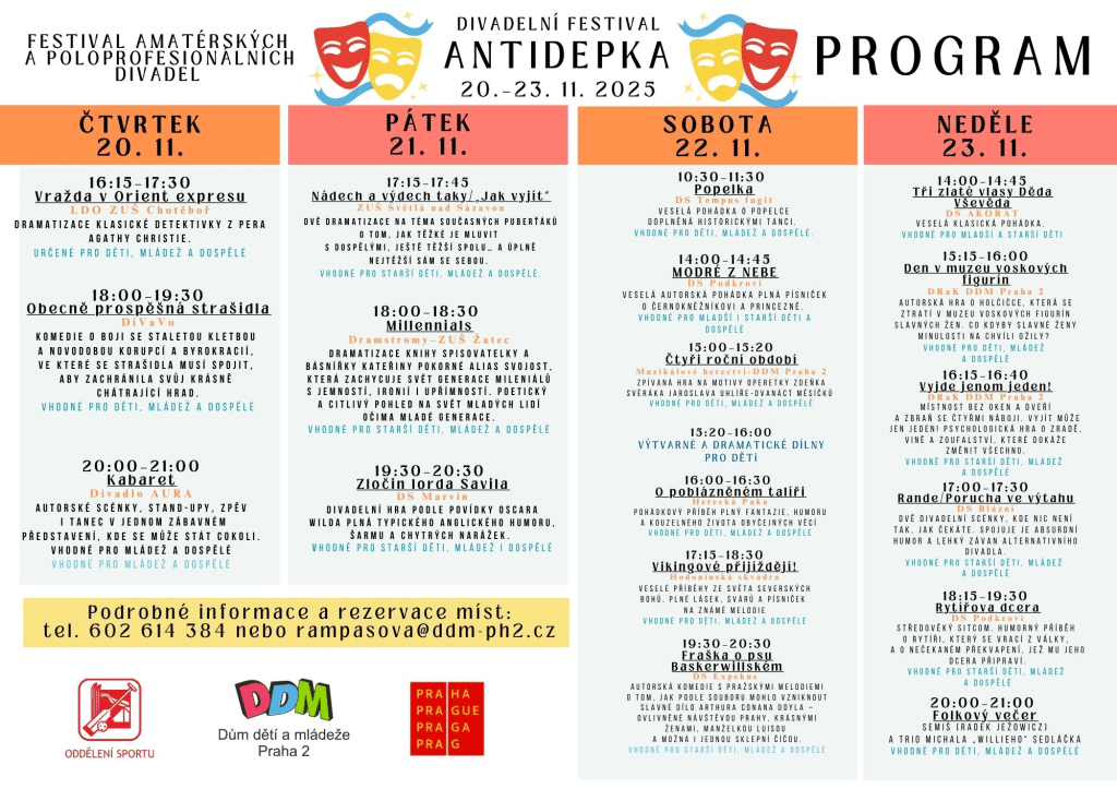 Festival potrvá až do neděle 23. listopadu a vystoupí na něm nejen divadelní soubory DDM, ale i mnohé další z různých částí republiky. V odpoledních hodinách diváky čekají dětská představení, navečer si pak na své přijde i dospělá část publika.